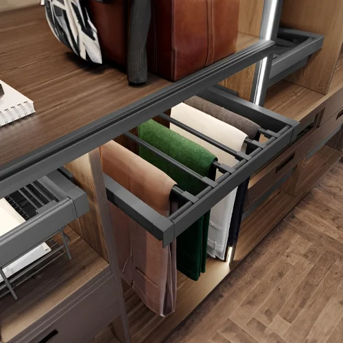Ulosvedettävä vaatetanko tuo lisää käytännöllisyyttä vaatekaappiisi. Sen avulla voit hyödyntää kaapin syvyyttä tehokkaasti ja saada vaatteet vaivattomasti esille. Tanko liukuu pehmeästi ulos ja sisään, ja sen tukeva rakenne kestää päivittäistä käyttöä. Sopii erinomaisesti ahtaisiin tai korkeisiin kaappeihin, joissa tila on rajallinen. Helppo asentaa ja käyttää.